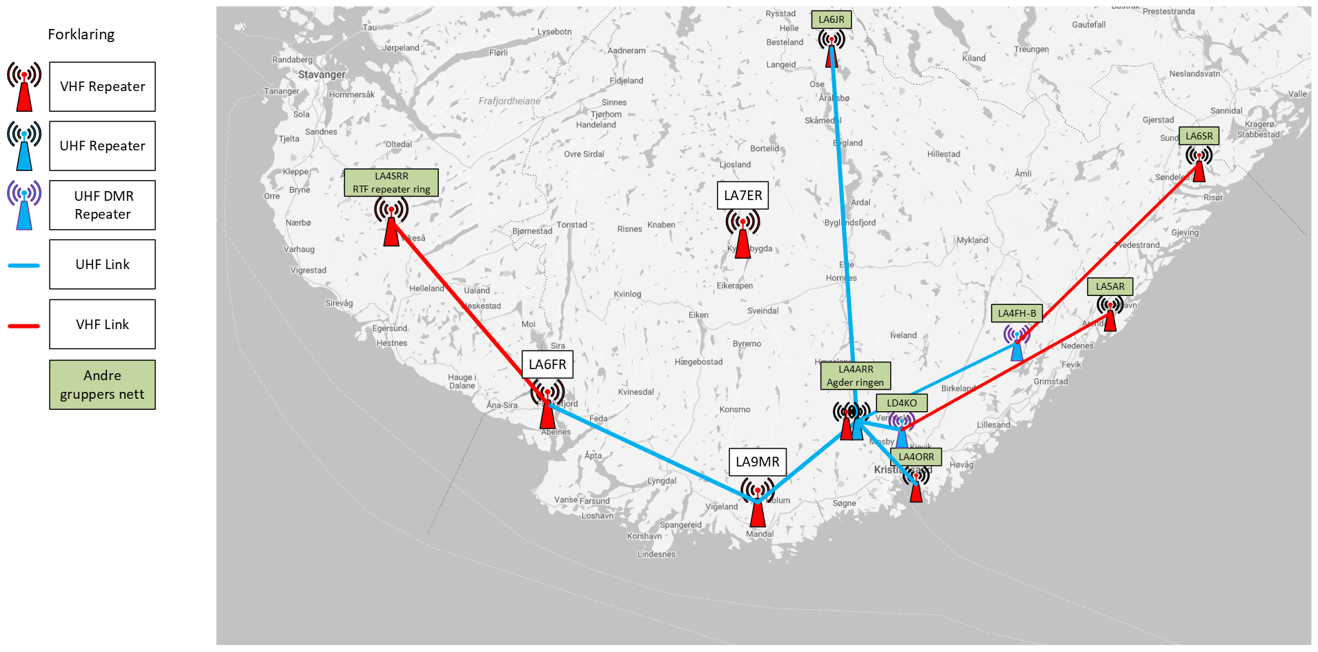 Repeaterne LA5FR og LA9MR er normalt alltid koblet sammen og utgjør et stabilt samband i området. I tillegg har vi mulighet for å koble dette nettet videre mot Agder Ringen og repeaterne til Sandnesgruppa, noe som kan gi dekning fra Risør i øst til Rogaland i vest. Koblingen mot Agder Ringen står nå innkoblet og det kjøres Agder ring kl20 hver søndag.